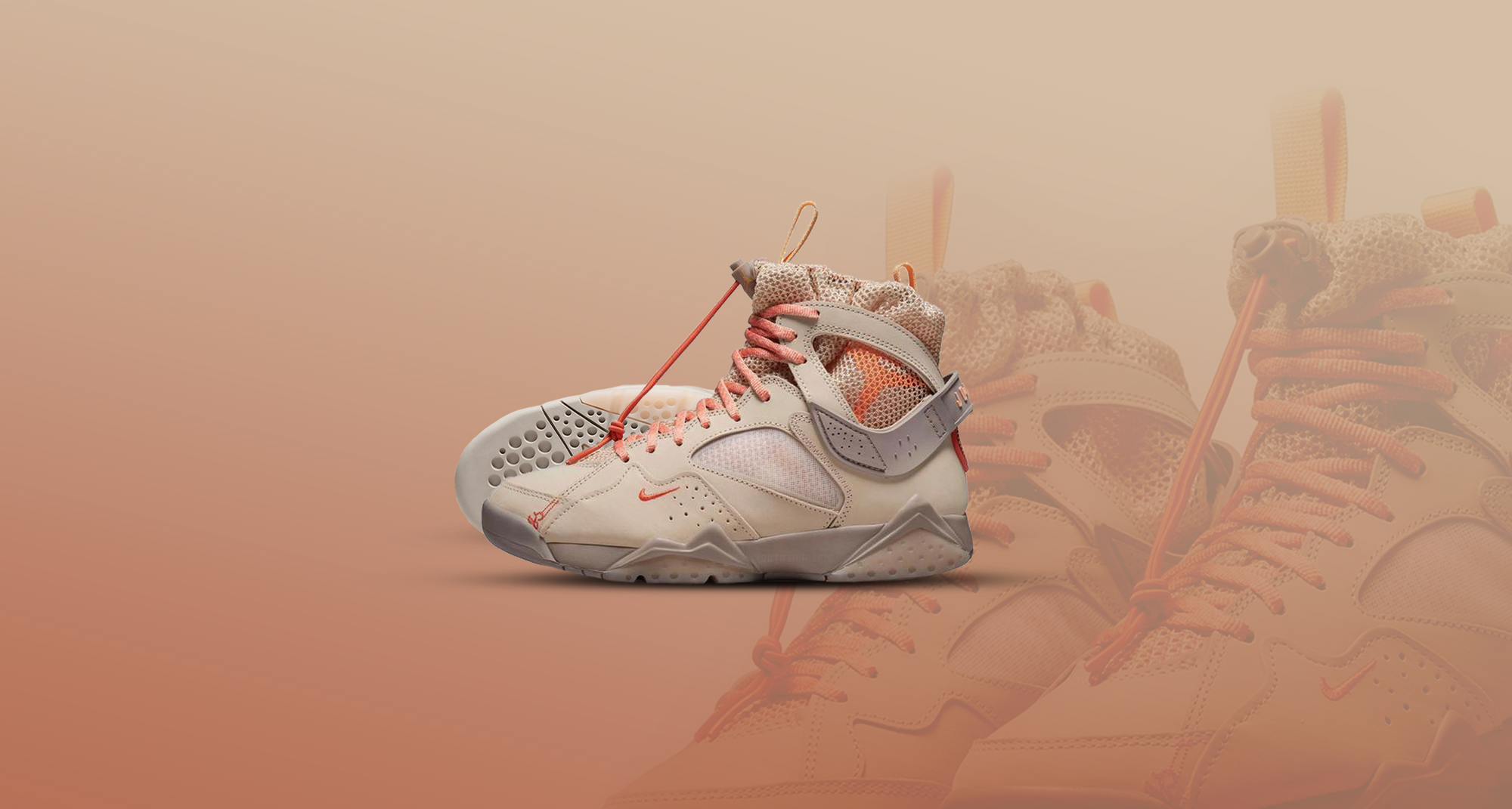 While the usual Air Jordan 7’s ankle support provides a more rigid feel, Gibbs has instead utilised a light mesh material to encase the inner sock liner which is tied with a drawstring attached to the bottom laces of the shoe. Additional smaller details include a mini Swoosh on the lateral side, again reminiscent of the Nike Air Mowabb we saw released in 2021, as well as a small stitching detail on the toebox to tie the orange detailing throughout the sneaker together.