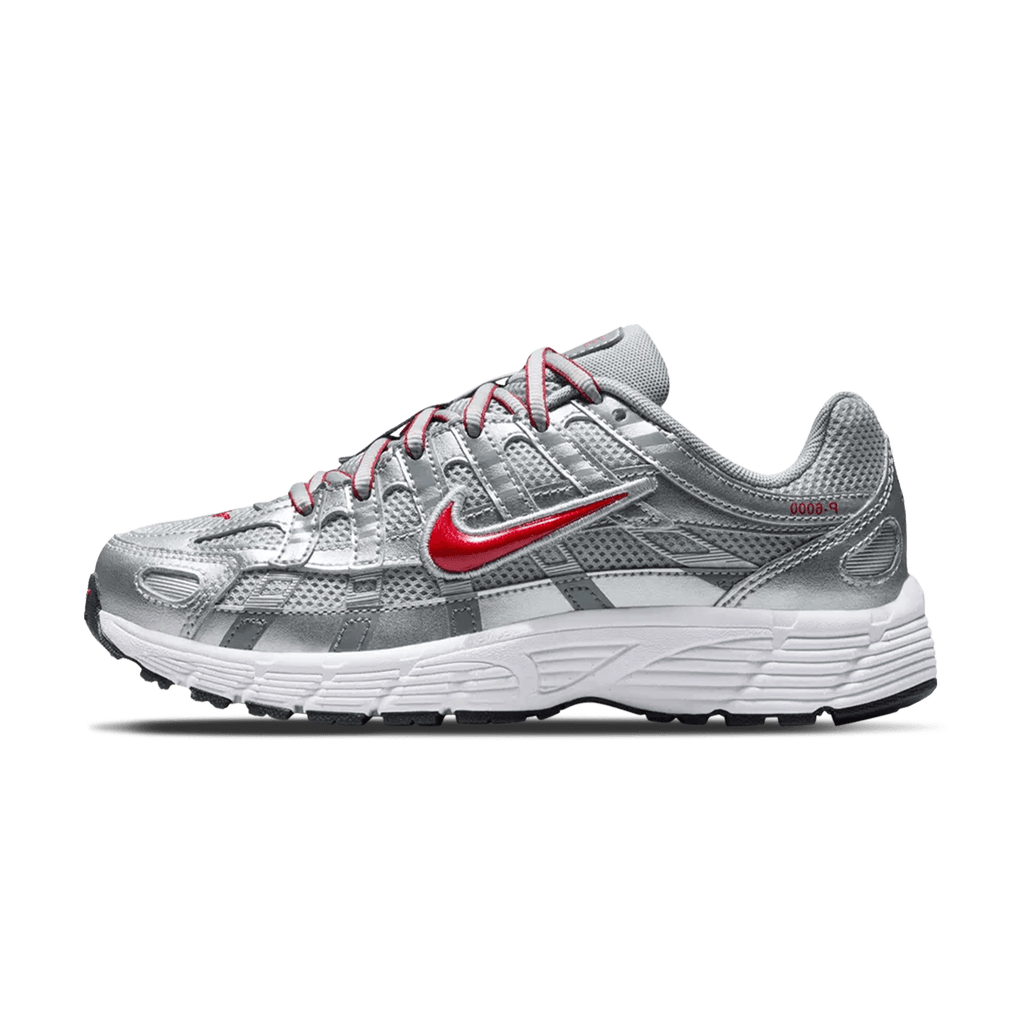 The Nike P-6000 GS 'Metallic Silver Gym Red' is a bold and stylish trainer that merges early 2000s running aesthetics with contemporary flair. Designed for older kids, this model features a breathable mesh upper in 'Metallic Silver', complemented by synthetic overlays in 'Flat Silver' and 'Cool Grey' for enhanced durability and style. The vibrant 'Gym Red' accents on the Swoosh and midsole add a striking contrast, making this trainer a standout choice for young sneaker enthusiasts.​